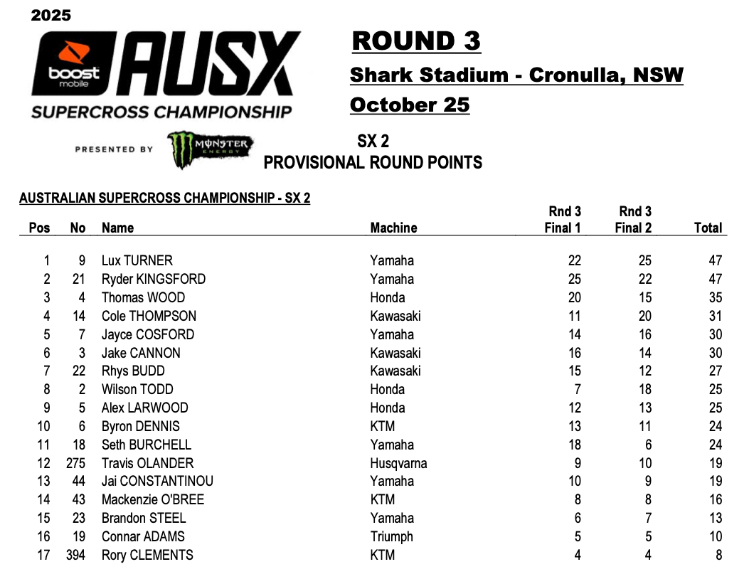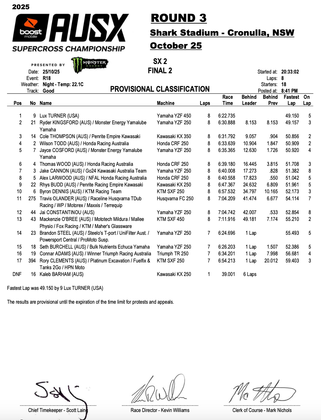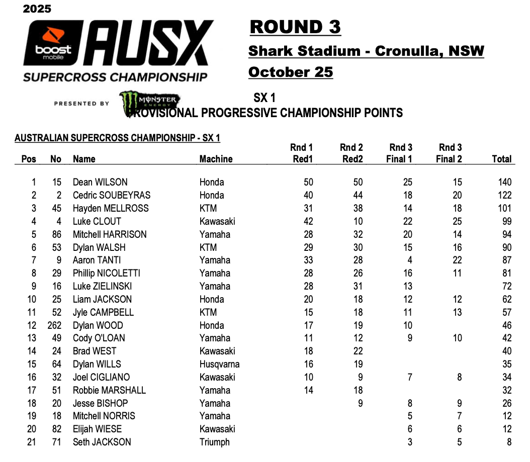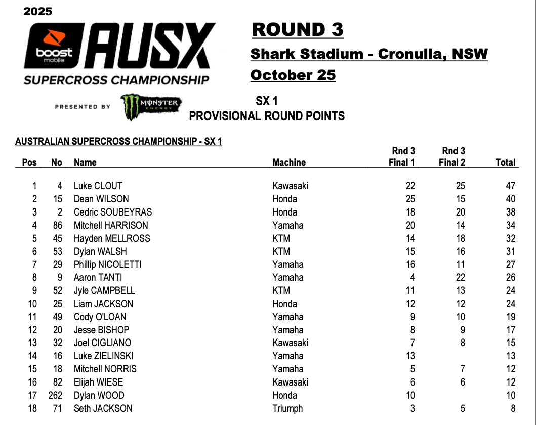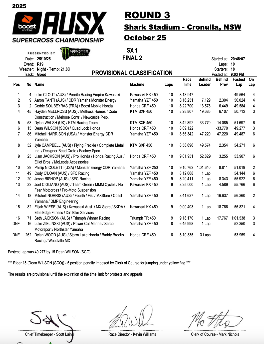 Dean Wilson appeared to have another flawless night in Sydney, claiming 1-1 finishes in the SX1 class. However, his perfect run was cut short after receiving a five-position penalty from the Clerk of Course for jumping under a yellow flag. As a result, Luke Clout was awarded the overall victory on the night.