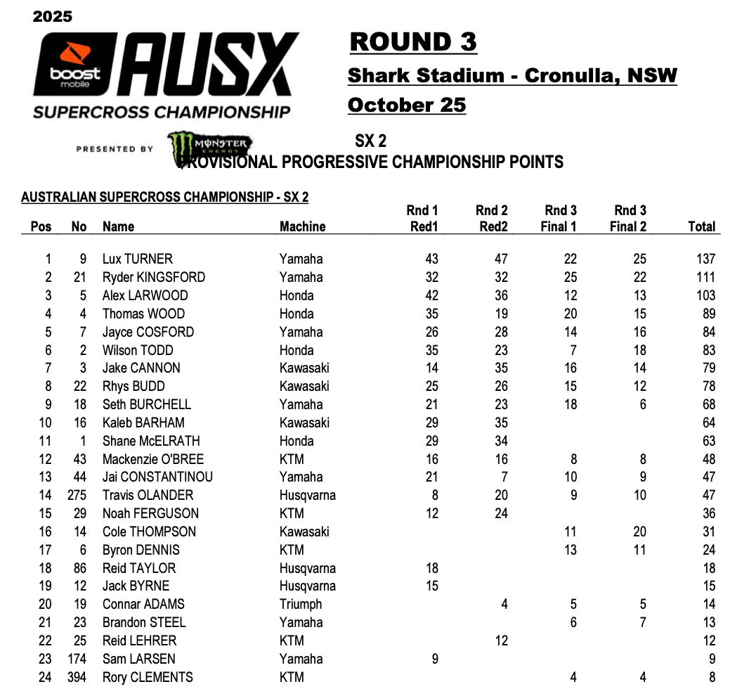 In the SX2 standings, Turner leads the way with a 26-point margin over Kingsford, with Larwood holding third place.