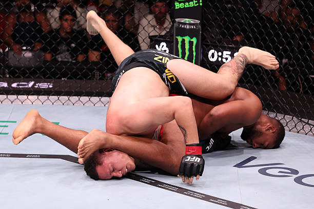 A minute into round 2 Diniz finds himself on bottom once again with Pinto in a strong dominant position. The Portuguese prospect lands brutal elbows on top cutting open the Brazilian. Pinto in full mount reigns down shots after trapping Diniz and the referee stops the contest.