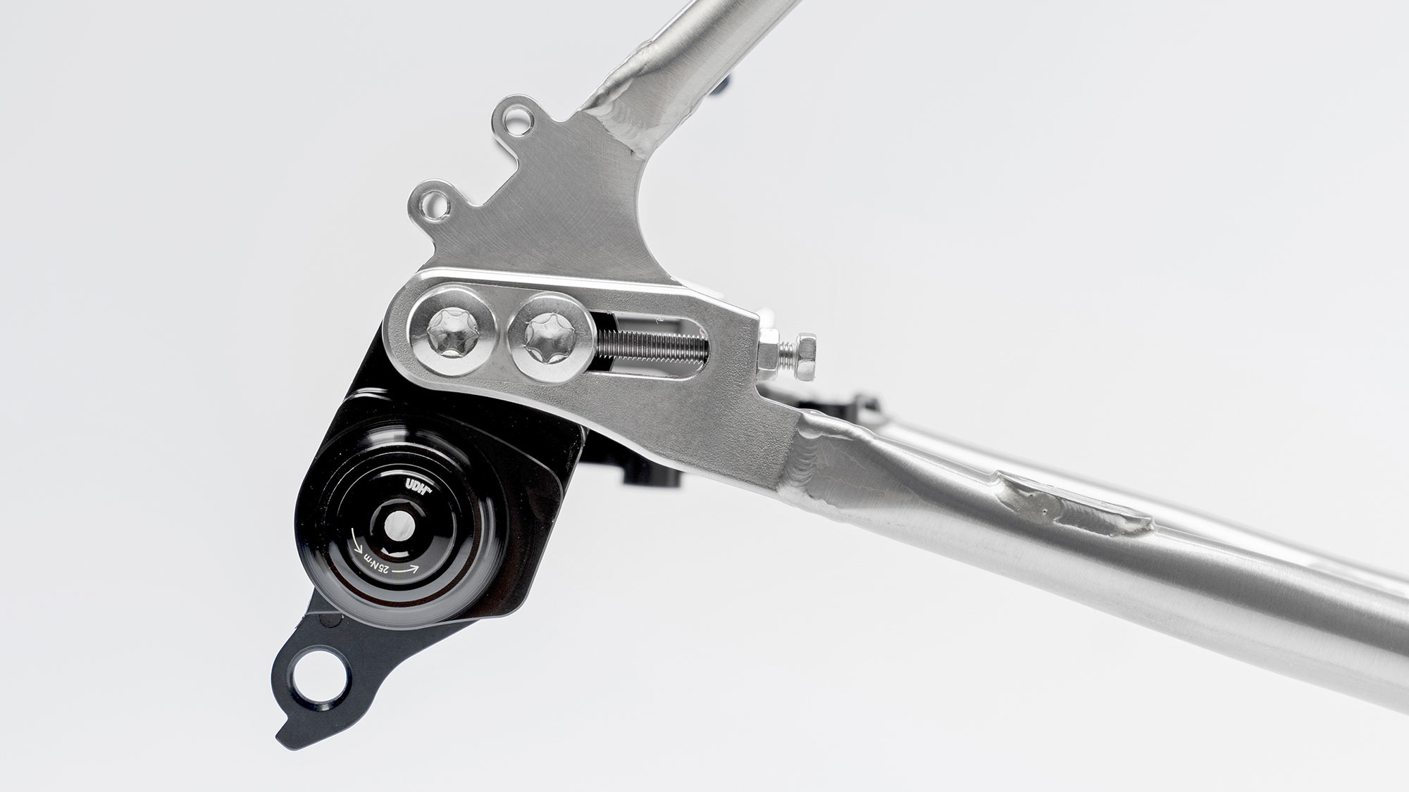 But, with the new UDH standard and the larger contact area of the full mount SRAM Transmission derailleurs, you actually needed more clear space between the traditional frame & slider. To make it all fit, Standert created a new stainless dropout. It now sits a bit higher above the axle, and gets more of a straight connection to the chainstay, which now meets the dropout higher off the ground to make more room for a derailleur in the forward-most position.